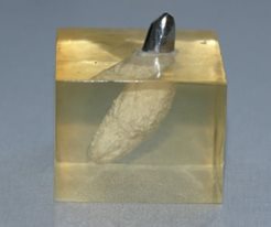 Foto: Een in kunsthars gegoten hoektand van een hond, waarop een stalen kroon is aangebracht. Let op de enorme lengte van de onder het oppervlak van het tandvlees gelegen wortel van de tand!
